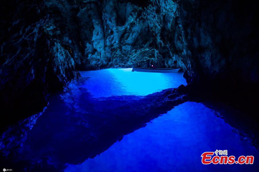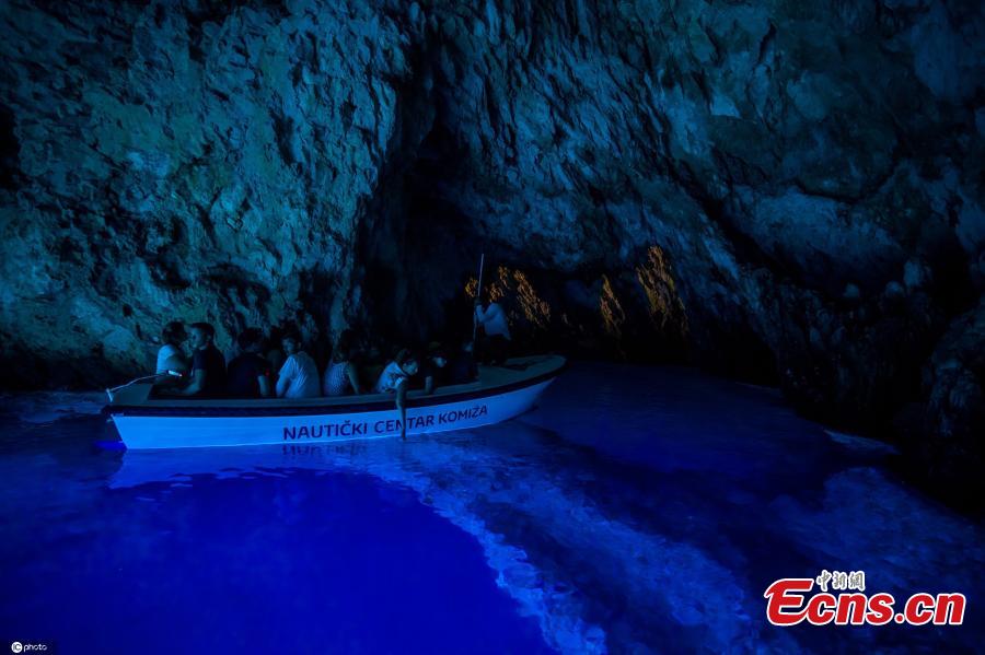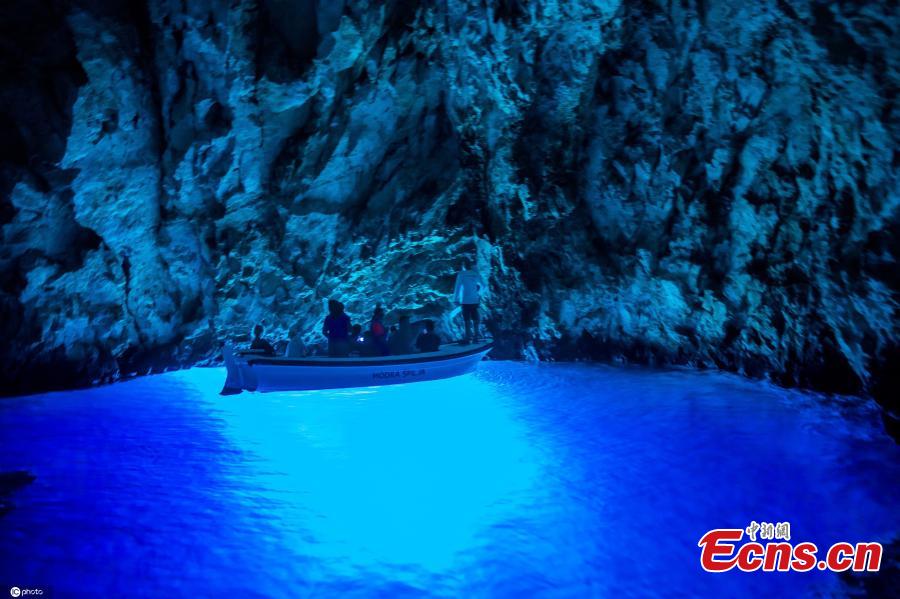 People boat-visit mystery Blue Grotto in Croatia's Bisevo