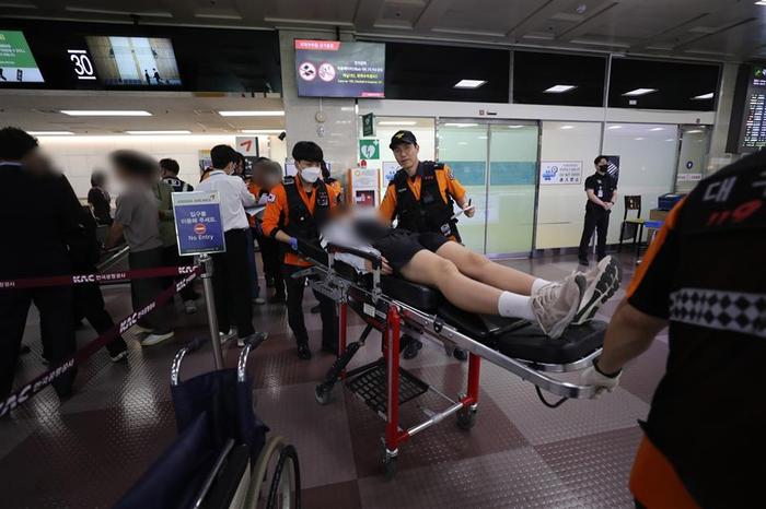 Rescue workers are seen moving students on stretchers at Daegu International Airport in Daegu, South Korea, on May 26. These students were among the 194 passengers on an Asiana Airlines plane, which experienced a sudden opening of one of its doors at 12:45pm, just before landing at the airport.